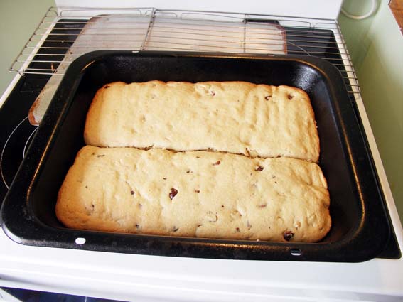You are then meant to bake it for 10 minutes on 180 degrees Celsius. For Biscotti however, I bake for 15 minutes on about 160 - you don't want the edges to get too crispy before the middles are cooked through.